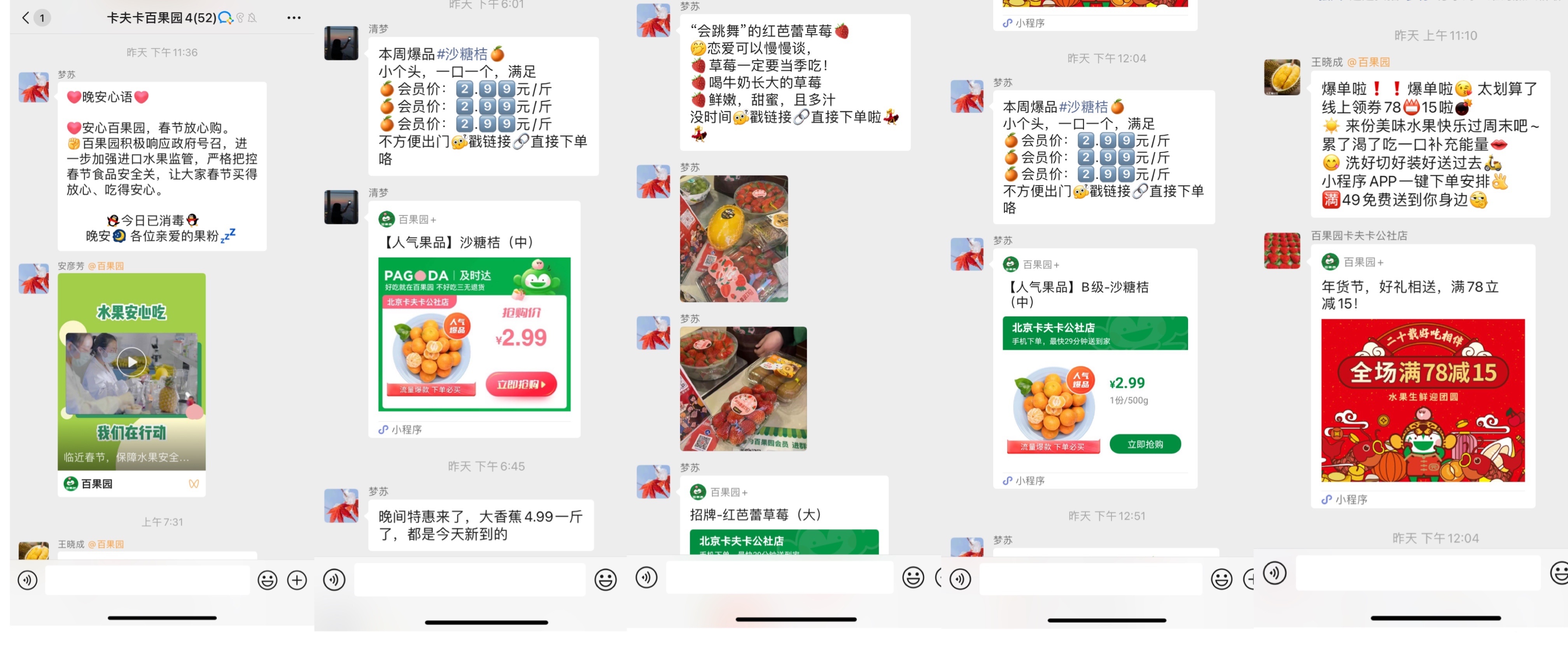 引导用户进群的话术比较无力,仅仅通过【水果动态】、【优惠活动】等引导进群,可以添加新人优惠券、下单抽奖等内容进行引导