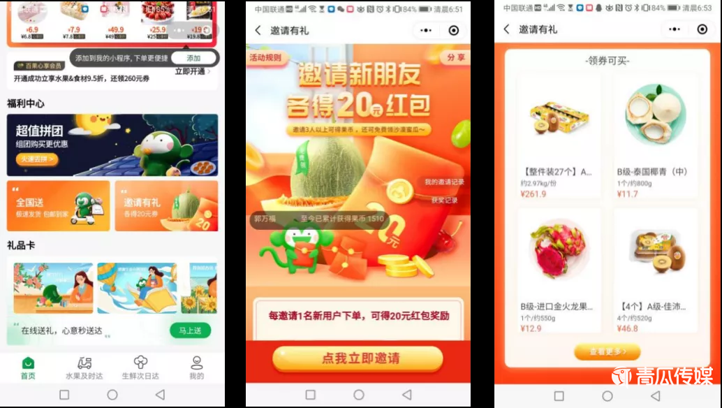 私域里做裂变增长是很适合像百果园这样的线下的零售品牌的。私域生态内的裂变活动百果园经常做,比如【朋友圈分享获取优惠券】、【百果园一元吃水果】、【超值拼团】等。