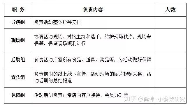 结合上边活动内容和时间的流程图,对应到具体每个阶段,每个工作应该交由谁来做,对应到人,责任到人,更加方便活动的落地和执行。
