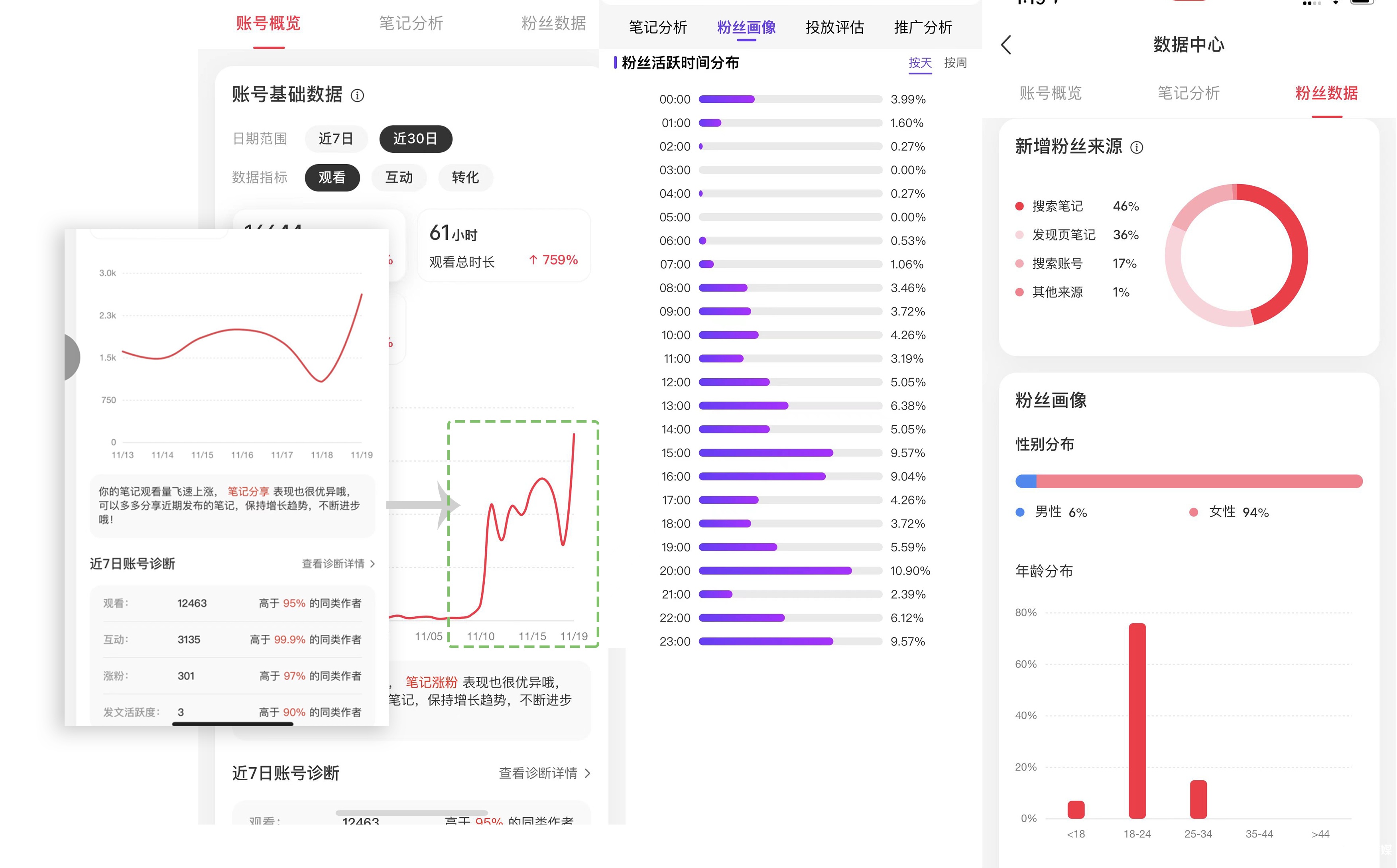 这里我说的持续运营并不是只日更,相反我从数据上推测出来日更会对爆款笔记有分流的效果,我所说的持续运营包括,持续的数据分析、内容总结和积累,以及一定周期内相对稳定的内容输出。小红书也并没有所谓运营节奏的说法,更不是像有些大神说的那样,规律更新会提高账号权重。
